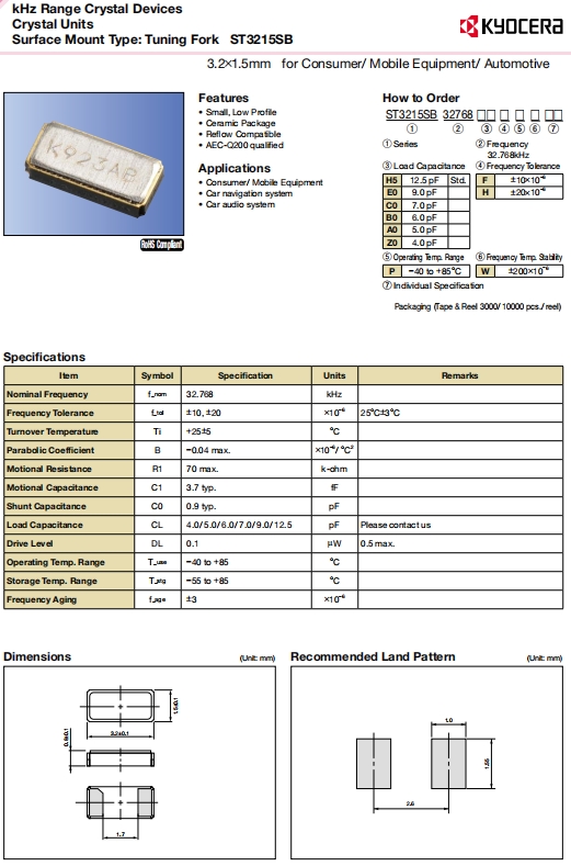 ST3215SB32768Z0HPWBB | AVX Corp/Kyocera Corp | ST3215SB, Kyocera | kHz Crystal (Tuning Fork) | 32.768kHz | -40°C ~ 85°C |