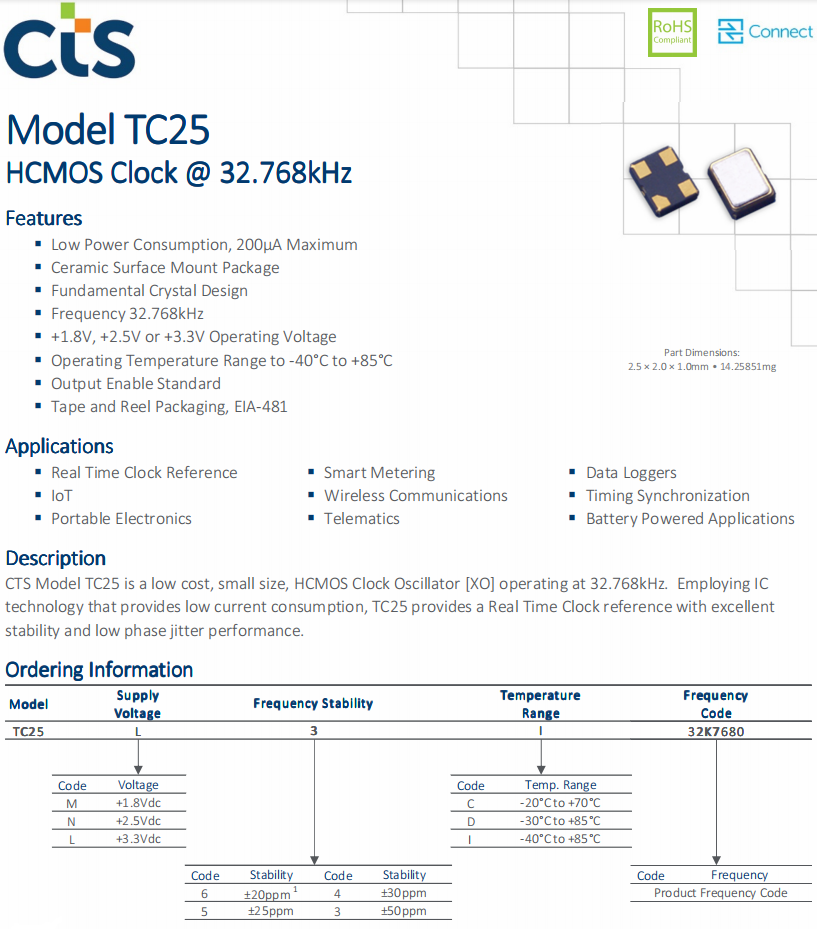 TC25L3I32K7680 | CTS晶振 | TC25 | 32.768kHz | ±50ppm | 貼片晶振 |