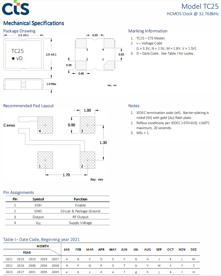 TC25M3I32K7680 | CTS晶振 | TC25 | 32.768kHz | ±50ppm | 4-SMD, No Lead |