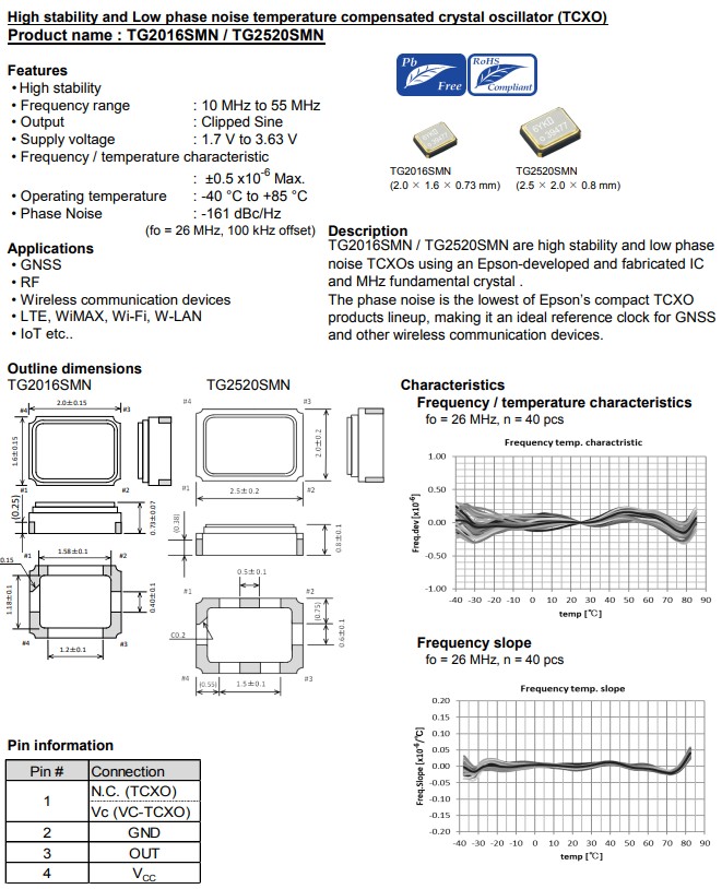 日本進口愛普生晶振TG2520SMN,高穩定性和低相位噪聲溫度補償晶體振蕩器,超小型尺寸2.5x2.0mm四腳貼片晶振,TCXO晶振,有源晶振,是高穩定性低相位噪聲,使用愛普生開發和制造的IC的噪聲TCXOs和MHz基頻晶體。 相位噪聲是愛普生緊湊型TCXO溫補晶振中最低的產品系列,使其成為GNSS的理想參考時鐘和其他無線通信設備。特征:高穩定性,頻率范圍:10MHz至55MHz,輸出:削波正弦,電源電壓:1.7V至3.63V,頻率/溫度特性 :最大0.5 x10-6,工作溫度:-40攝氏度至+85攝氏度,相位噪聲:-161 dBc/Hz(fo = 26 MHz,100 kHz偏移),應用于:GNSS 射頻,無線通信設備,LTE、WiMAX、Wi-Fi、無線局域網,物聯網等.