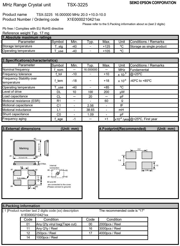 X1E000021042116 | 3.2 x 2.5 x 0.6mm | TSX-3225 | 16.000000 MHz | 20 pF | +/-10 ppm | +/-18 ppm | -40 to +85 °C |