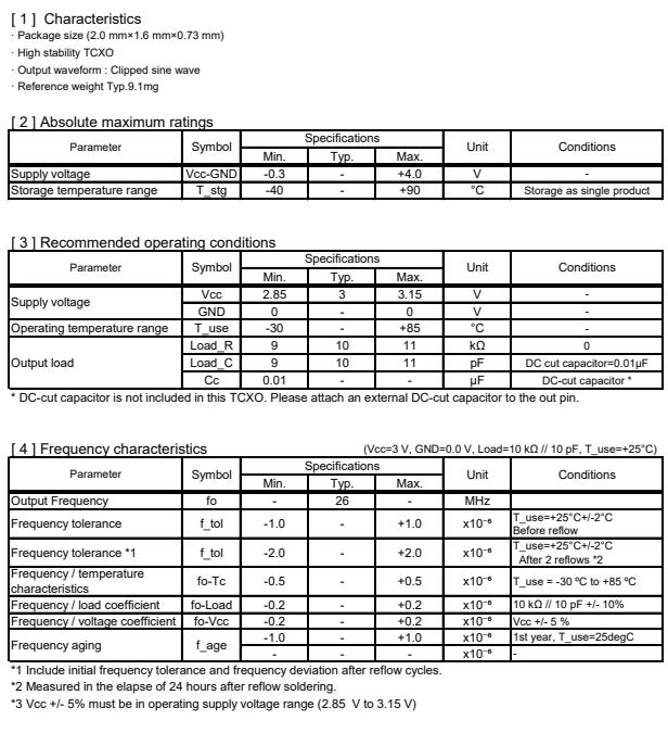 X1G004131001016 | TG-5006CJ | 26.000000 MHz | 2.00 x 1.60 x 0.73 mm | 2.850 to 3.150 V | +/-2.0 ppm | -30 to +85 °C | +/-0.50 ppm |