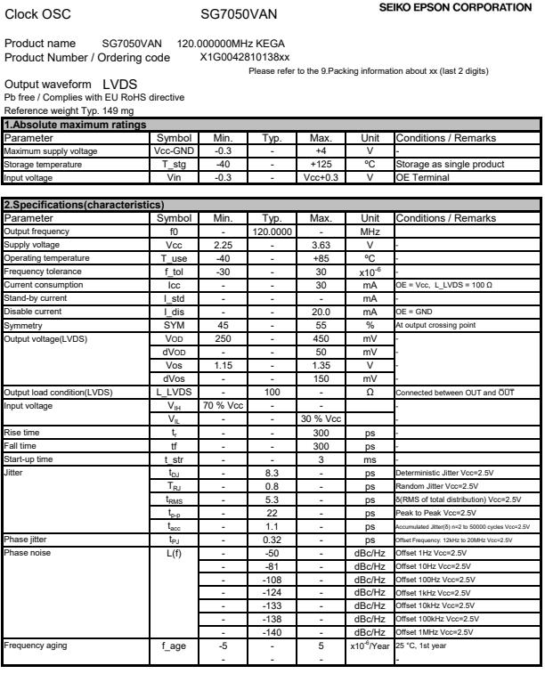X1G004281013800 | SG7050VAN | 120.000000 MHz | 7.00 x 5.00 x 1.60 mm | LVDS | 2.250 to 3.630 V | -40 to 85 °C |