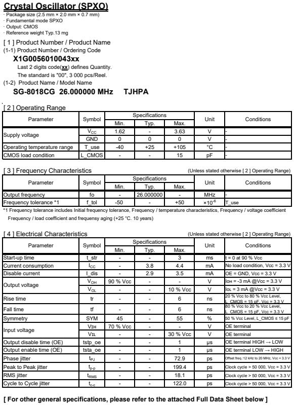 X1G005601004300 | SG-8018CG | 26.000000 MHz | 2.50 x 2.00 x 0.80 mm | CMOS | 1.620 to 3.630 V | -40 to 105 °C | +/-50 ppm | ≤ 4.4 mA |