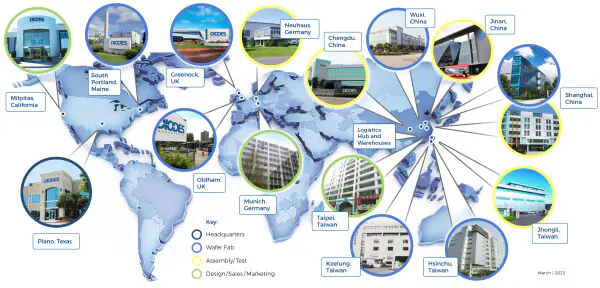 Diodes 公司總部及美洲銷售辦公室位于美國德州普拉諾 (Plano) 與加州米爾皮塔斯 (Milpitas)。設計、營銷與工程中心位于普拉諾、米爾皮塔斯、臺北、桃園、竹北、上海、揚州、英國奧爾德姆及德國紐豪斯 。Diodes 的晶圓生產(chǎn)設施位于美國緬因州南波特蘭;英國格林諾克奧爾德姆;中國上海和無錫;還有基隆和新竹。Diodes 在中國上海、濟南、成都、無錫、中壢和基隆以及德國紐豪斯設有組裝與測試設施。另外在多個據(jù)點設有工程、銷售、倉儲及物流辦公室,包括臺北、香港、上海、深圳、武漢、揚州;英國奧爾德姆;南韓城南市以及德國慕尼黑、法蘭克福,并于世界各地設有支持辦公室。